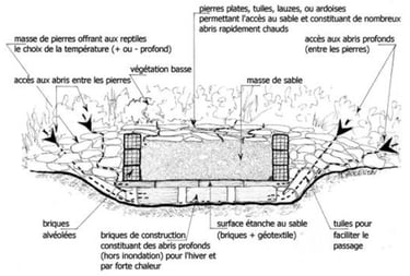 Cet aménagement d’abris en pierre sèche permet de répondre au maximum aux besoins de cette espèce. Il bénéficie d’un espace semi-enterré qui peut être réalisé grâce à un regard en béton par exemple, cet espace protégé du gel et des fortes chaleurs sera idéal pour le Lézard Ocellé durant sa brumation (léthargie hivernale propre aux reptiles et amphibiens) et durant les fortes chaleurs d’été. Une couche de géotextile soutiendra un espace sableux propice à cette espèce ovipare avec un lieu de ponte pour l’incubation de leurs œufs. En haut de cet abri, des pierres plates type ardoise où lauze seront disposés afin de favoriser la thermorégulation avec un solarium exposé Sud. Pour finir, des tuiles seront disposées à l’intérieur permettant ainsi des accès aux différents parties de l’abri.