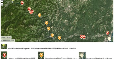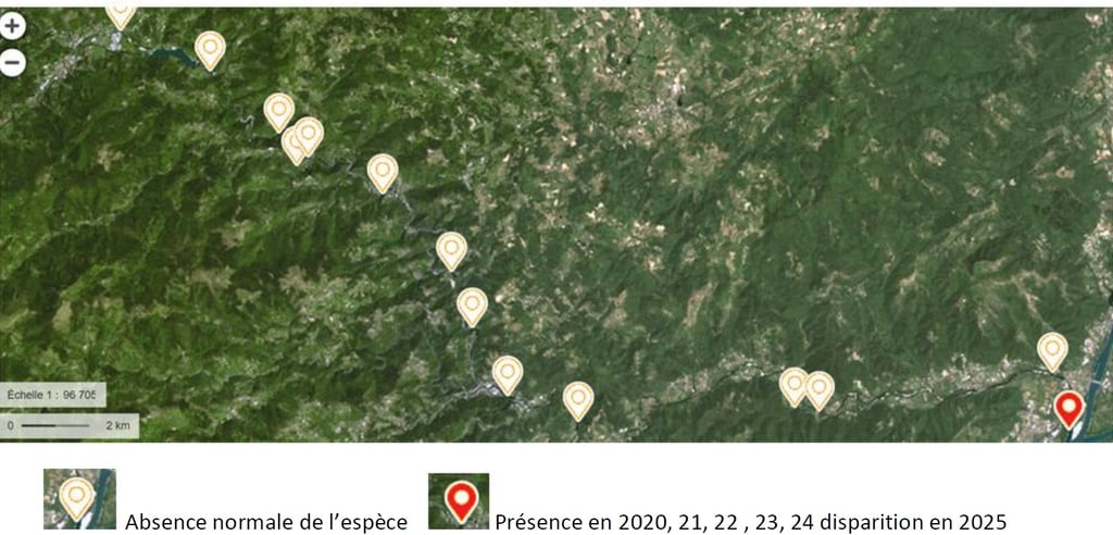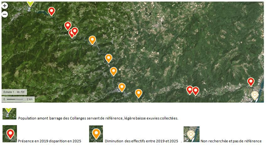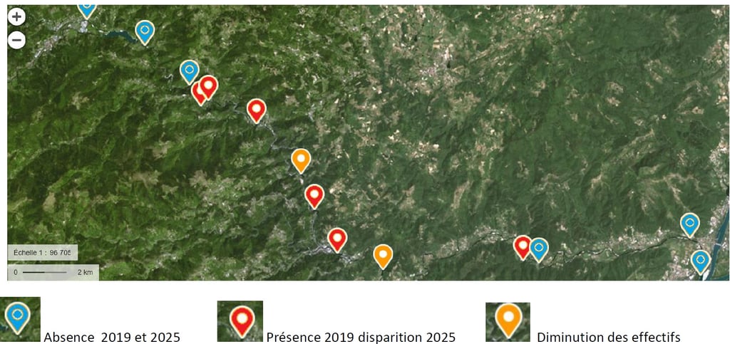 Cette espèce, découverte sur l’Eyrieux en 2013, marquait la limite nord-est de sa répartition mondiale. Entre 2019 et 2025, elle a perdu près de 18 km de territoire. Les populations en aval du barrage ont chuté de 40 à 100 %, tandis que celles de l’amont restent stables.