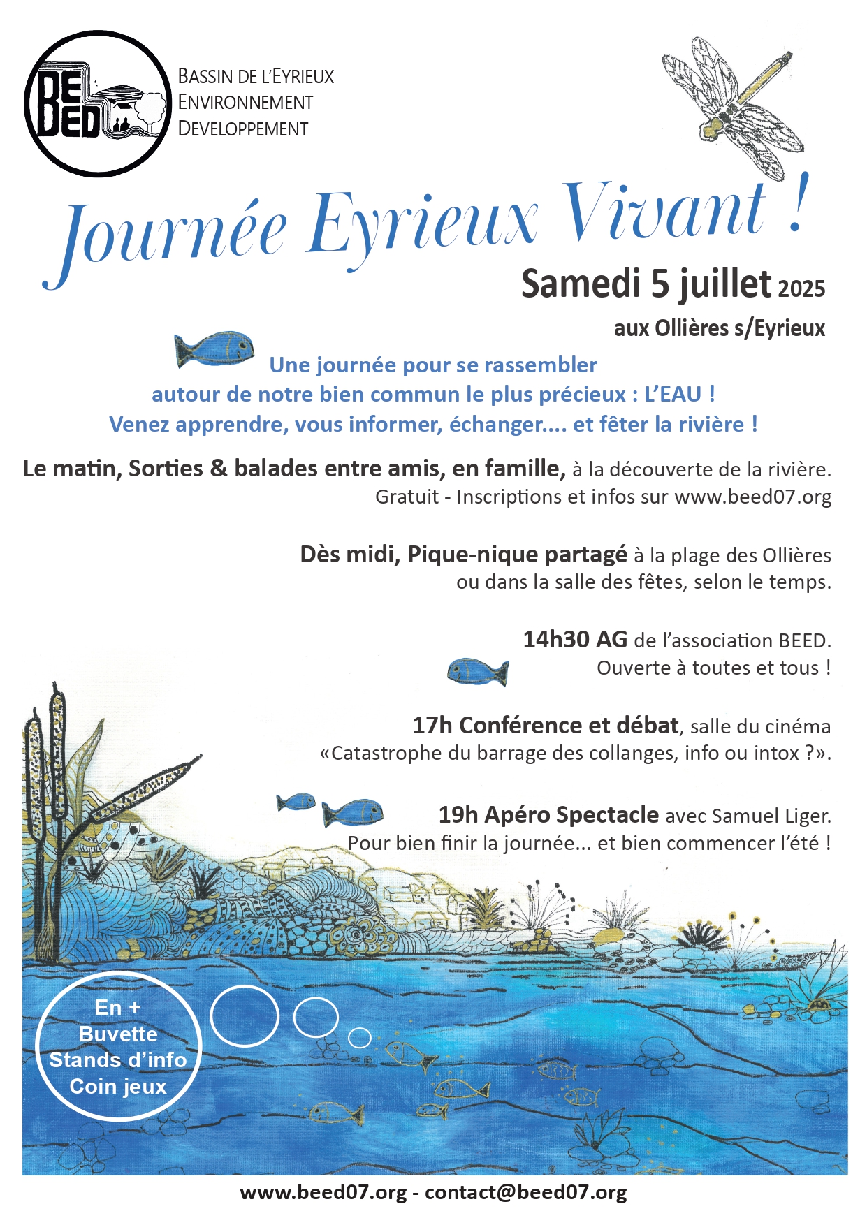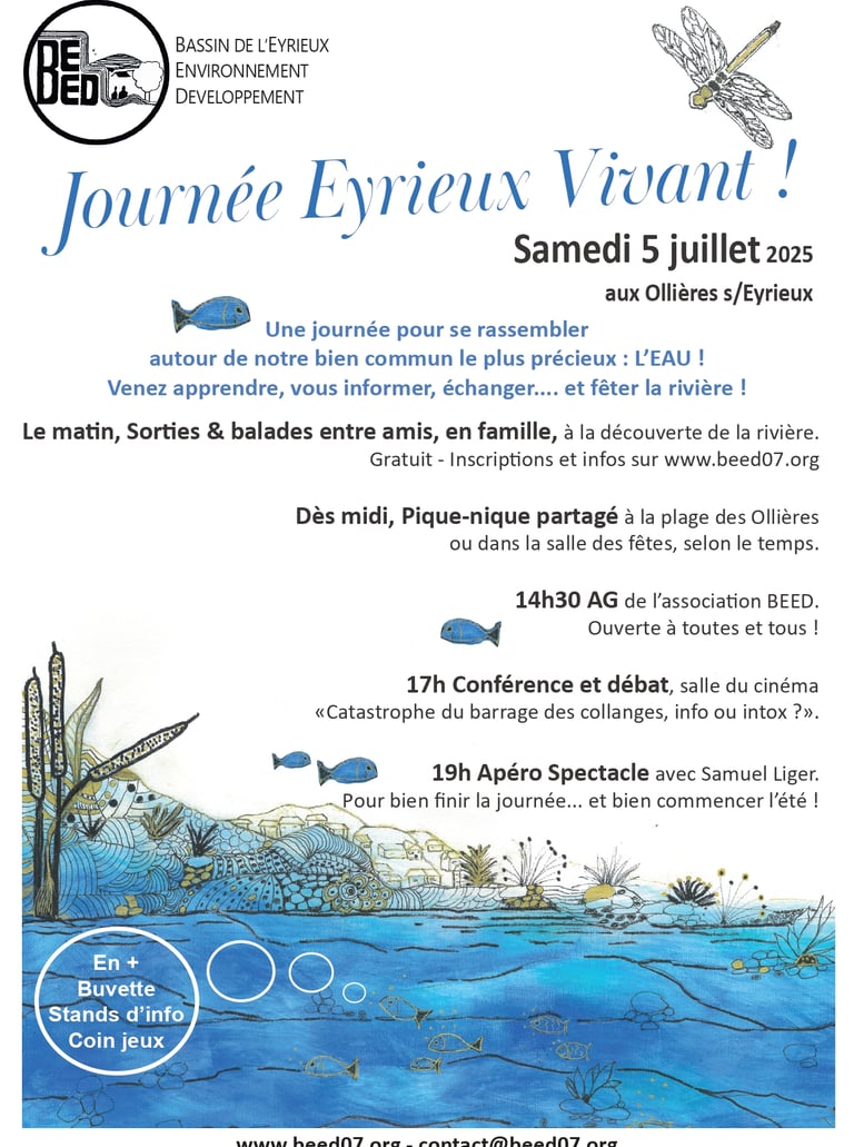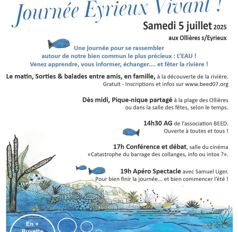 Samedi 5 juillet 2025, aux Ollières-sur-Eyrieux. Une journée pour se rassembler autour de notre bien commun le plus précieux : L’EAU ! Venez apprendre, vous informer, échanger... et fêter la rivière !