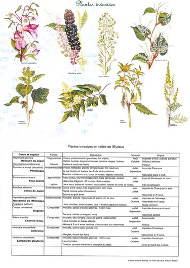 La plaquette ci-dessus que nous avions fait paraître avec notre ami regretté Christian Giroux en 2009, représentait quelques-unes des espèces végétales invasives présentes aux Ollières. La liste ne mentionnait que les principales, pas plus que les arbres comme le faux-acacia, l’ailanthe, ou le prunelier.