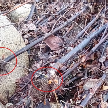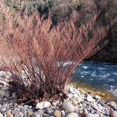 Cannes mortes couchées et arrachées par les crues hivernales, avec des bourgeons (entourés en rouge)