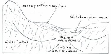 Le massif de roche cristalline est peu aquifère, les nappes d'eau qu'il contient ne sont ni des lacs ni des rivières ! Ce sont des milieux poreux (capacité à stocker l’eau) ou bien perméables (capacité à se laisser traverser par l’eau) où l'eau circule à travers un réseau connecté de pores ou de fissures.