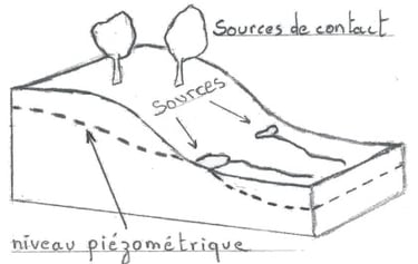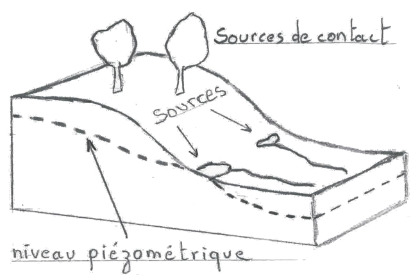 Les sources apparaissent lorsque la surface piézométrique affleure le terrain naturel, elle sont de contact ou de déversement, les failles son propices à leur apparition.