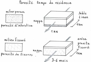 Ces roches sont "porteuses" d'eau car l'eau souterraine est partout. Elle circule et se stocke dans les vides (interstices, fissures, fractures, failles) jusque profondément.