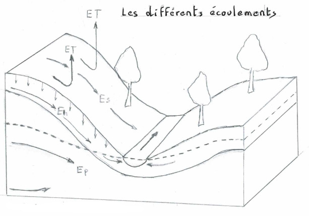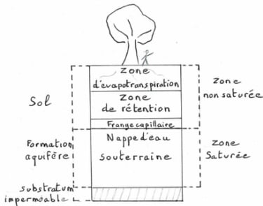 A un niveau plus ou moins profond l'eau rencontre un milieu imperméable qui peut être d'argile ou de roche cristalline au fissures fermées ou colmatées.